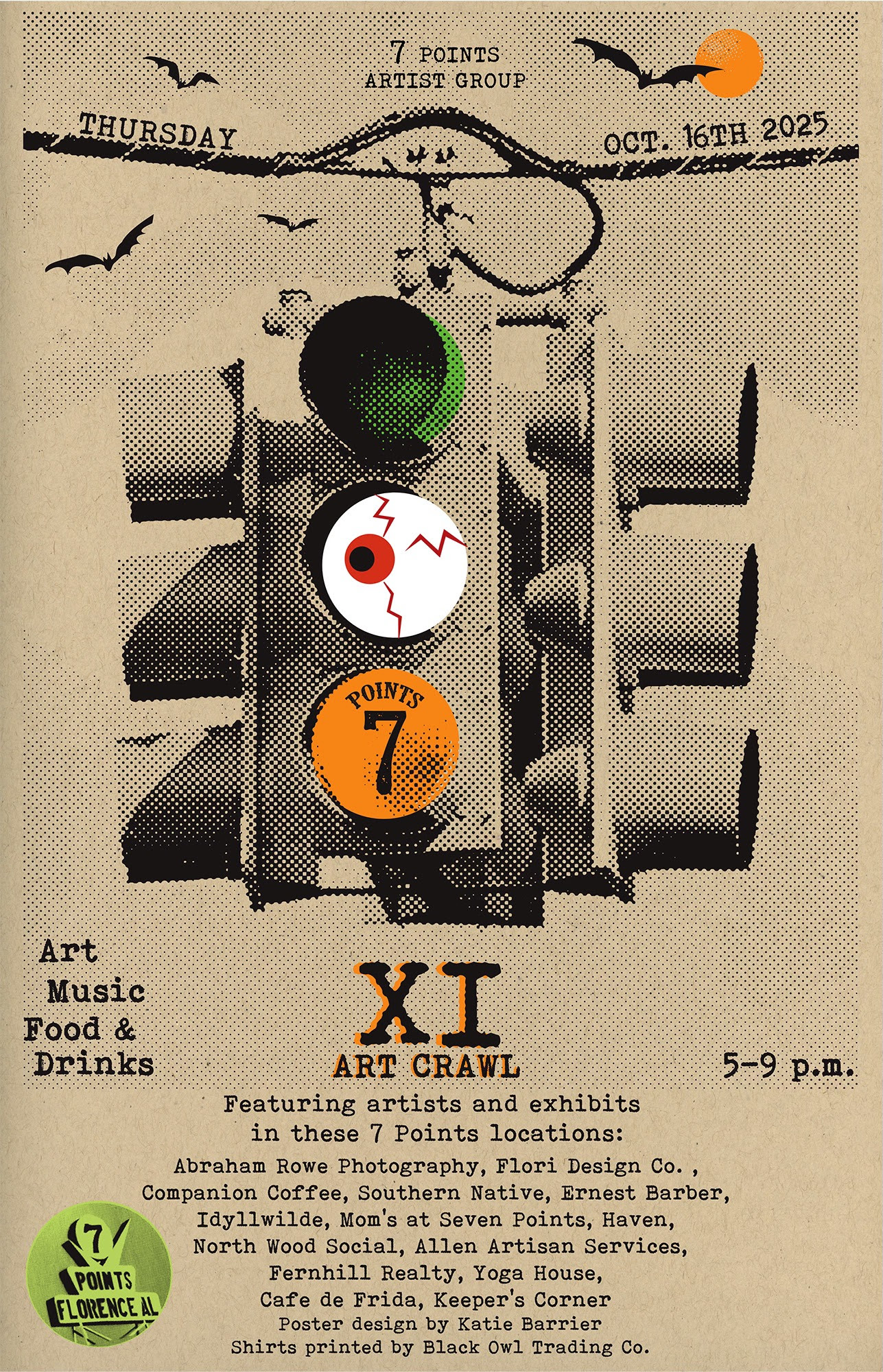 FLORENCE-The Seven Points Arts Community welcomes you to the 11th annual Art Crawl Thursday, October 16th, from 5-9. The 7 Points Art Crawl is a self guided tour of art exhibits, open studios, installations, pop-up’s, and music, all in 7 Points! Other shops in the area will be staying open late.