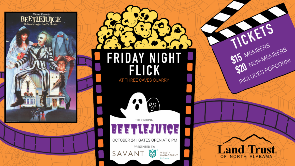 HUNTSVILLE-Join the Land Trust of North Alabama for a special Friday Night Flick screening of the original cult classic Beetlejuice at one of Alabama’s most unique venues Three Caves at Monte Sano Nature Preserve. The event takes place Friday, October 24, with gates opening at 6 PM. Admission includes free popcorn and water, with additional food available for purchase from Cave City BBQ and drinks also available on site.