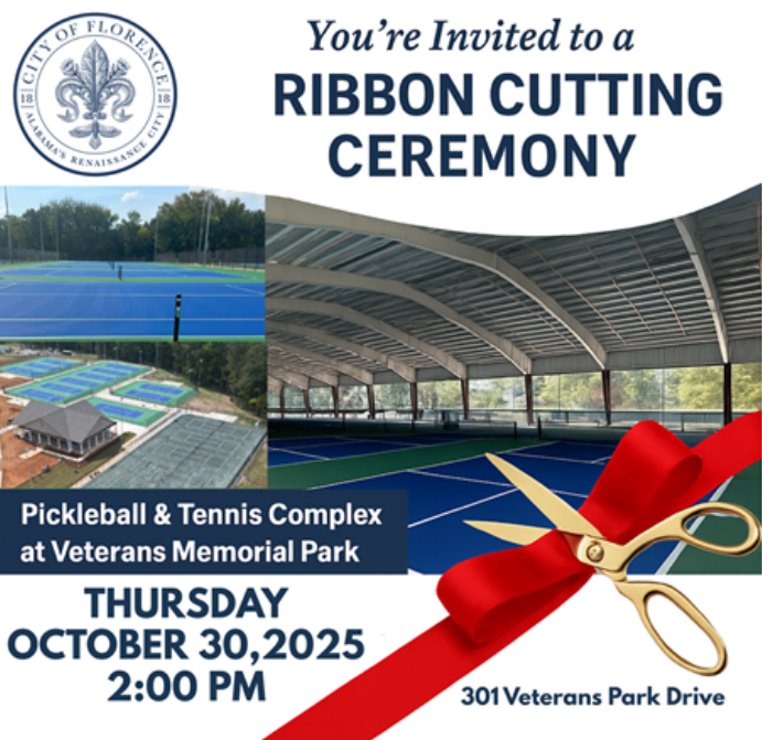 FLORENCE-Mayor Andrew Betterton, the Florence City Council, and the Florence Parks & Recreation Department invite you to the grand opening and ribbon-cutting ceremony for the new Tennis & Pickleball Complex at Veterans Memorial Park.